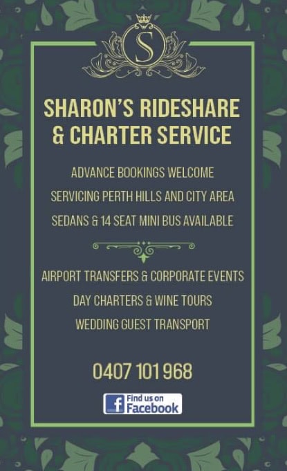 Tour Groups Contact Information Sharon Gill 296 Kalamunda Road, Maida Vale, WA, 6057 0407101968 sharonlee.68@hotmail.com Detailed InformationSharon’s Rideshare provides Airport Transportation, Private Charters, Wine & Op Shop Tours.